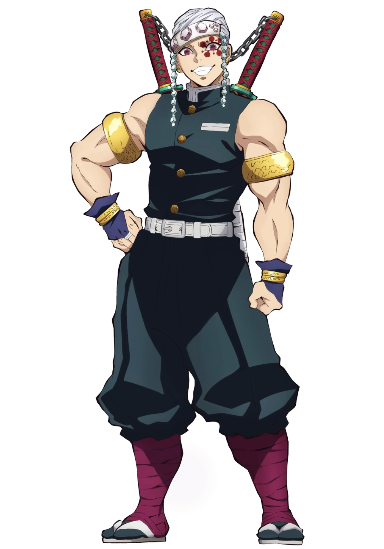 - Einzigartige Waffen: Passend zu Tengens extravaganter Persönlichkeit trägt er ebenso extravagante Waffen mit sich. Als Hauptwaffe verwendet er zwei überdurchschnittlich große Nichirin-Klingen, die jeweils eine Kerbe in den scharfen Enden ihrer Klingen haben und am Griff durch eine Metallkette zusammengehalten werden. Seine Schwerter sollen große Mengen an Sprengkraft haben und es wird gesagt, dass bis Tengens Kampf mit dem zunehmenden Mond Nummer sechs noch niemand einen Schlag von ihnen überlebt hatte. Er trägt auch Bomben mit sich und nutzt seine Fähigkeiten, um sicherzustellen, dass Menschen keinen Kollateralschaden erleiden, wenn er sie verwendet. Er ist einer von fünf Säulen, die mit einer einzigartigen Waffe kämpfen.