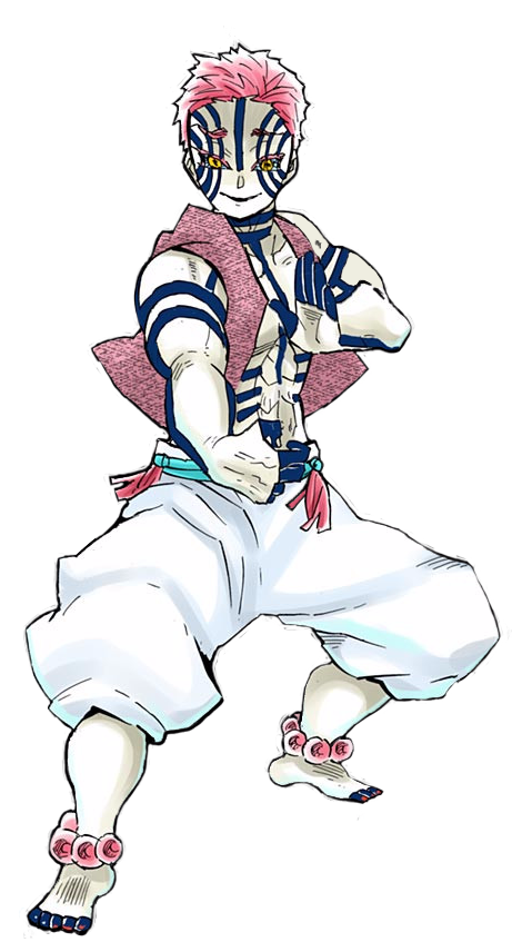 Las líneas que cubrían la parte superior de su torso, se extendían y luego doblan de manera recta en cada uno de los costados de sus brazos, uniéndose con una línea horizontal que rodeaba al bicep. Debajo de esta línea, se encontraba otra línea horizontal y a los costados de ésta, se extendían dos líneas rectas que llegaban hasta el final de la muñeca de Akaza[8]. Tanto en sus manos como en sus pies, se podía visualizar que todos sus dedos, eran azules y sus uñas estaban pintadas de color naranja[9].