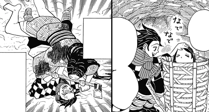 Nezuko puede manipular su cuerpo según lo que necesite; a la izquierda, aumenta su tamaño y musculatura para someter a Tanjirō mientras que a la derecha vemos cómo se encoge para introducir su cuerpo dentro de la canasta para poder entrar sin problemas.