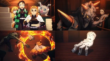 Alors que les lumières recommencent à clignoter, un énorme démon émerge de la vue, effrayant les passagers et surprenant les tueurs de démons. Kyojuro se demande si son Pouvoir Sanguinaire avait caché son corps. Il menace le démon et dégaine sa lame, énonçant à haute voix qu'il la brûlera jusqu'aux os s'il attaque l'innocent. Le démon rugit en réponse et charge, contre quoi Kyojuro riposte en utilisant son Souffle de la Flamme, Premier Mouvement : Mer de Flammes, accélérant et le décapitant instantanément. Le trio est étonné de son exploit mais Kyojuro ajoute qu'il y a un autre démon à bord. Il avance, obligeant Tanjiro et Inosuke à le suivre tandis que Zenitsu, toujours effrayé, demande timidement de ne pas le laisser derrière lui. Les lumières clignotent à nouveau mais le conducteur et les passagers, ayant couru de l'autre côté pour éviter le démon, disparaissent.