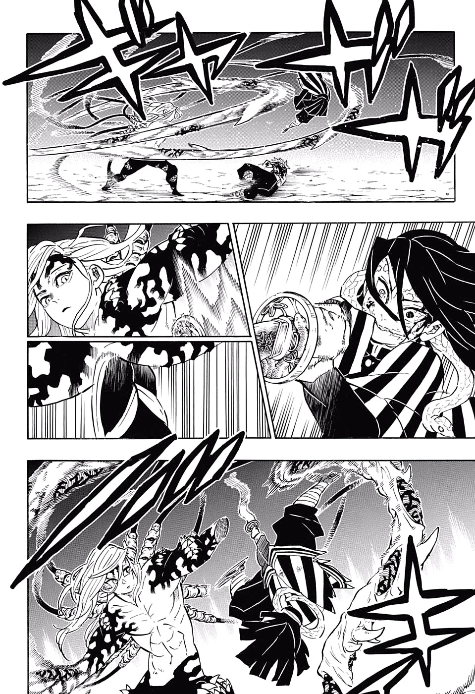 Санеми улыбается, когда замечает, что его опухоли исчезают, а Гёмей также замечает, что его собственный бешеный пульс и постоянная боль исчезают, и Столпы снова могут сражаться с большей легкостью, за что Санеми благодарен. Гёмей отмечает, что это, возможно, лишь временное лекарство от симптомов, и то, что им повезло, что такое событие произошло. Мудзан быстро приходит к выводу, что произошло, и понимает, что это сделал Тамаё, проклиная ее за то, что она была бельмом на его боку даже после смерти. С огромной яростью он начинает бешеную атаку, которая создает несколько кратеров в ландшафте перед ним.