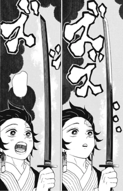 Танджиро хватает его клинок, который начинает светиться и превращаться в оттенок черного. Минутой молчания делили, пока Хотару не сердито набрасывается на Танджиро за непреднамеренное изготовление черного клинка вместо пылающего красного клинка, который он хотел видеть.