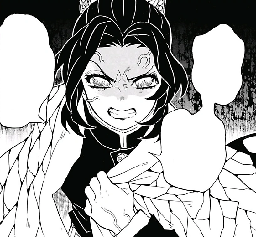 Позже, услышав их полную историю, она проявляет больше сострадания как к Танджиро Камадо так и к его сестре. Позже выяснилось, что её внешне спокойный и безмятежный характер носит как маску, так как Шинобу испытывает сильную ненависть к Демонам из-за потери её сестры , Канаэ Кочо, в молодом возрасте, а также смерти её родителей , почти всех её Цугуко семей её учеников в Особняке Бабочек. Эта ненависть настолько сильна, что она находится в почти постоянном состоянии крайнего гнева, который ощущается Танджиро Камадо когда эти два человека ведут беседу. Жажда мести лишила её возможности жить нормальной жизнью, которую желала ей сестра, и вместо этого она посвятила всю свою энергию победе над Демонами. Во время своей битвы против Доумы Шинобу показывает, что она также страдает от комплекса неполноценности из-за своих более низких физических способностей по сравнению со своими товарищами Столпами, завидуя им за то, что они обладают более высокими или более мускулистыми телами, чем она, и проклиная себя за то, что она не развивалась дальше, чтобы сделать её более эффективной в бою.