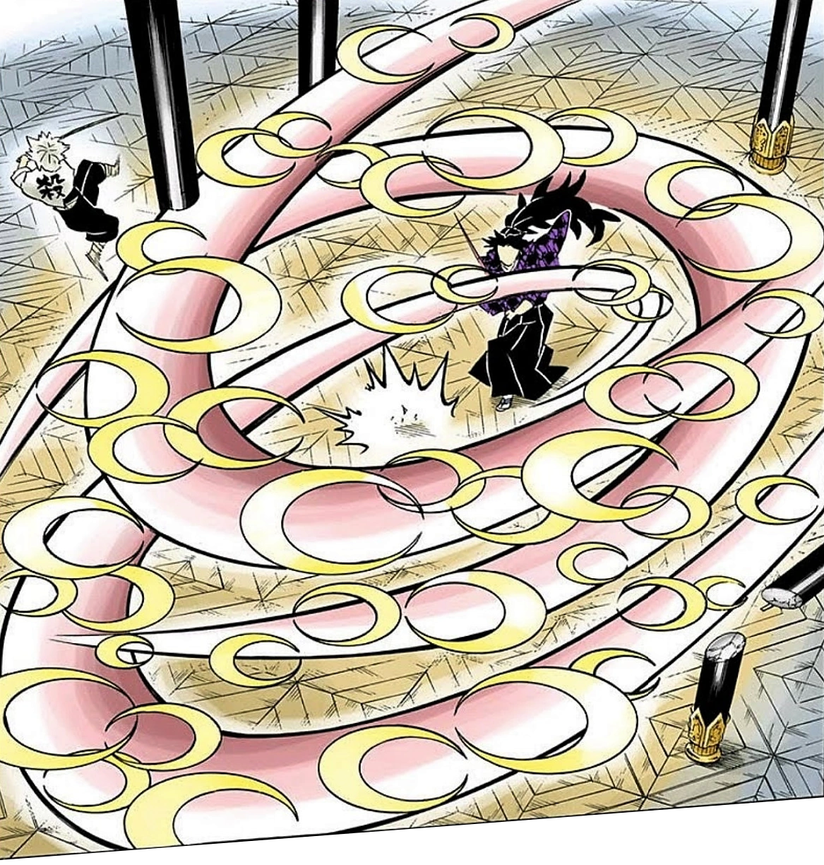 As Muichiro and Genya call out to him, Sanemi begins to grow frustrated at his lack of breathing room, noting that he almost died because he narrowly misses the tip of his swing. Kokushibo reminisces on a time during the Sengoku period when he and the Wind Hashira of then would spar together to improve their skills. Using Moon Breathing, Sixth Form: Perpetual Night, Lonely Moon - Incessant, Kokushibo unleashes a frontal wave of slashes and blades, cutting Sanemi across his chest and limbs and additionally slashes apart the surrounding pillars. Genya bemoans being unable to see the battle with the pillars and lattice walls obstructing his view.