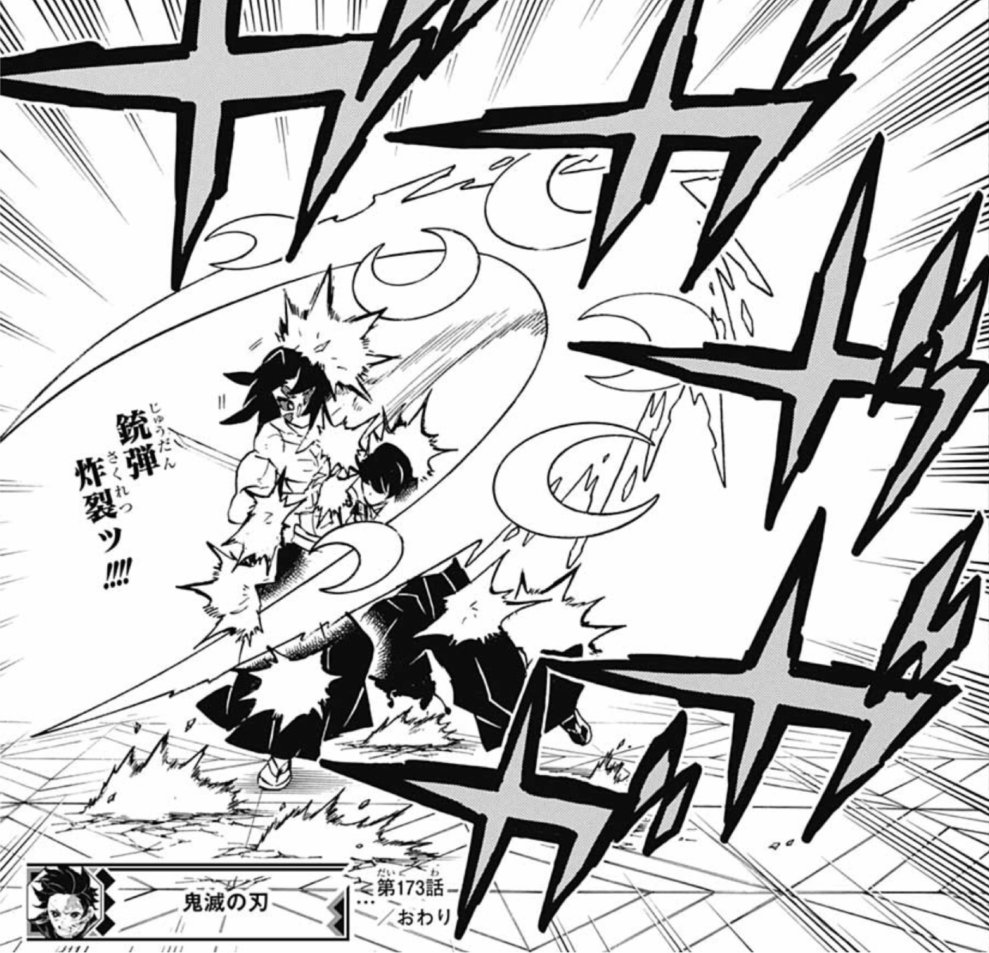 - Muichiro, Sanemi, and Gyomei attack at once to avoid Kokushibo's wide-sweeping attack, resulting in Muichiro stabbing his katana into the demon at the cost of his leg.