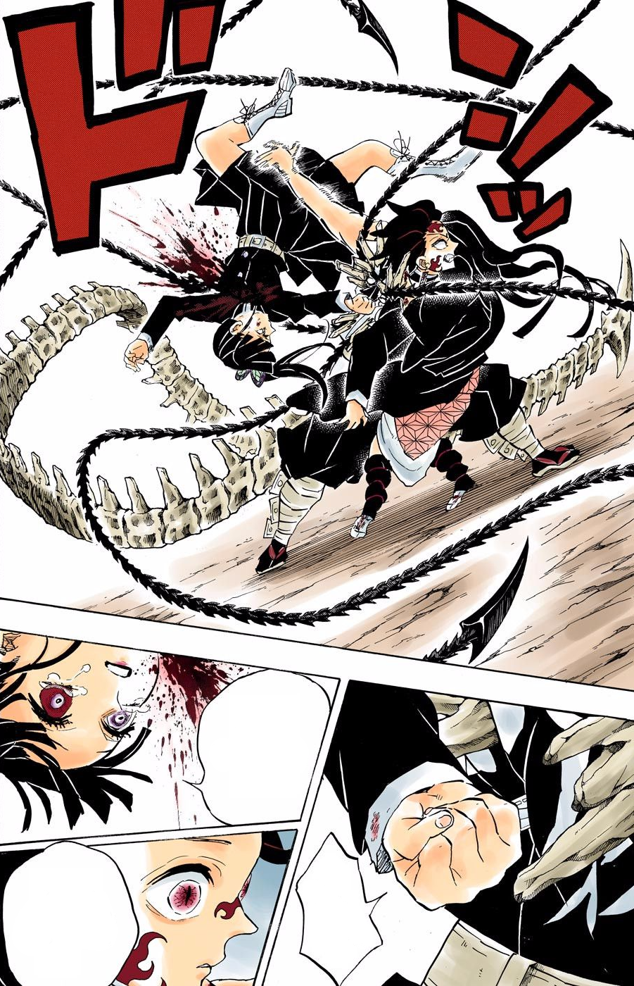 Angered, Tanjiro lets out another feral howl and sends out a shockwave that flings Inosuke, Zenitsu, and Giyu back as Nezuko desperately clings on to her brother. She falls to the ground as Tanjiro gets on all fours and releases bone whips, similar to those of Muzan Kibutsuji from his back. She begs him to keep fighting his newfound Demonic tendencies, however, he still swings a whip towards Zenitsu.