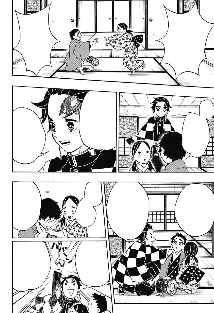 Tanjiro recalls that Tamayo had treated his wounds after his previous battle but remains injured, wondering if he can win in his condition. He notes being in constant pain since the battle and it was exacerbated when he met Zenitsu and pulled him off the woman, and now, his additional lack of balance threatens to get him sliced by Kyogai's attack. He thinks back to Sakonji's advice, who told him that Water Breathing is extremely versatile having ten forms. Though he realizes he can still fight, he tries to find his spirit to continue and thinks back to Zenitsu's whining that "a broken Tanjiro won't do!", annoying him.