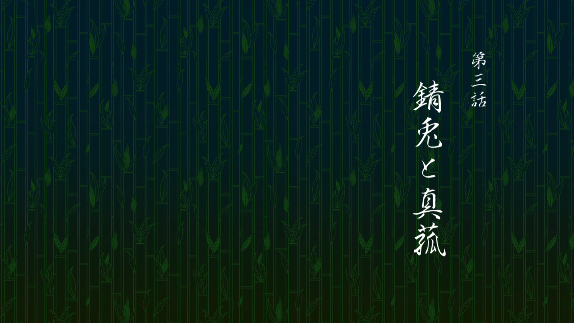Tanjiro’s blade slices Sabito’s mask, which falls and reveals his face, curved into a relieved smile. Makomo sees this and smiles gently as well. She commends Tanjiro’s success and says a final message of advice: “Win, okay, Tanijro. Beat that guy, too.” She and Sabito disappear from the forest in a haze, and Tanjiro realizes that his swing, believing he had slashed Sabito's mask, has actually sliced the boulder in half.