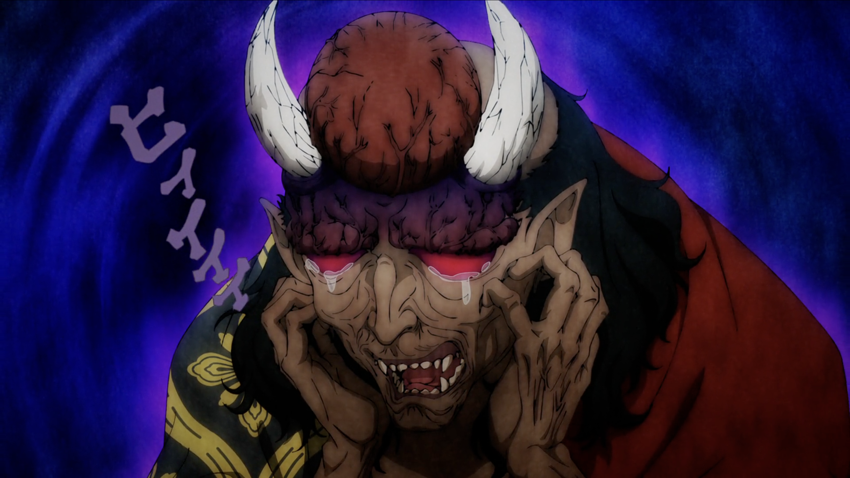 Hantengu was a short, frail man with a very thin and skeletal body, covered with veins and wrinkles, and is usually seen crouching. His most noticeable feature is a large bump on the top of his head, accompanied by two curved horns and a prominent brow ridge that lacks eyebrows. His face was thin with a sharp chin along with a sharp nose, and he constantly wore an expression of terror and fear with a rictus grimace. He had brown skin and his forehead was also noticeably shrivelled and discolored reddish-purple. His eyes are narrow and often appear to be squinting, obscuring his miotic pupils, mostly showing a red sclera on his eyes. He has golden irises, with the kanji of Upper Rank (