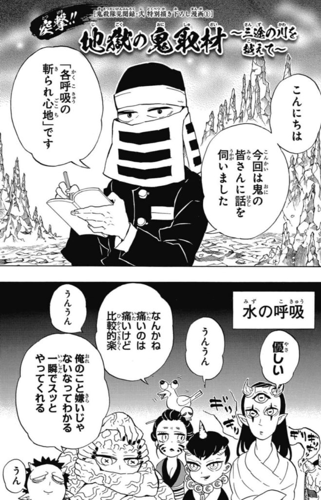 Goto crosses the Sanzu River and enters the Underworld, hoping to interview the deceased demons on what it is like to be killed by certain Breathing Styles. For the demons killed by Water Breathing, they answers that it was gentle and causes little pain; the Hand Demon adds that it bore no malice and was over quickly, while the Swamp Demon only grinds his teeth. The demons who were killed by Wind Breathing all answer that it was excruciatingly painful and extremely powerful, and it felt as if their attacker, Sanemi Shinazugawa, truly hated them. The demons who fell to Flower Breathing claim their killer, Kanae Kocho, was graceful and angelic, and that it felt soft, pleasant smelling, and ended with her saying kind words, as if to send them to Heaven.